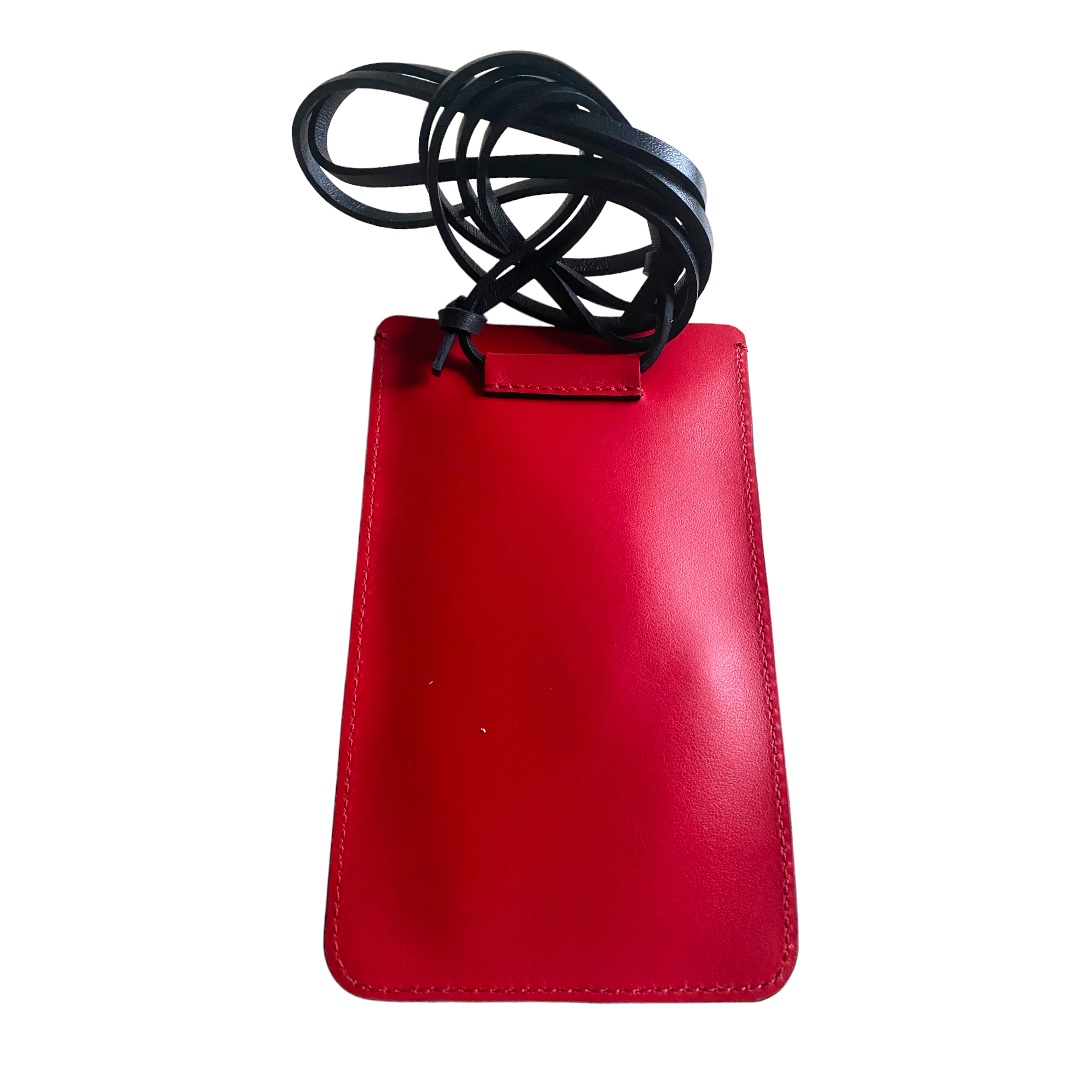 Made of soft leather, it can be worn crossbody, thanks to the adjustable strap, or around the neck.