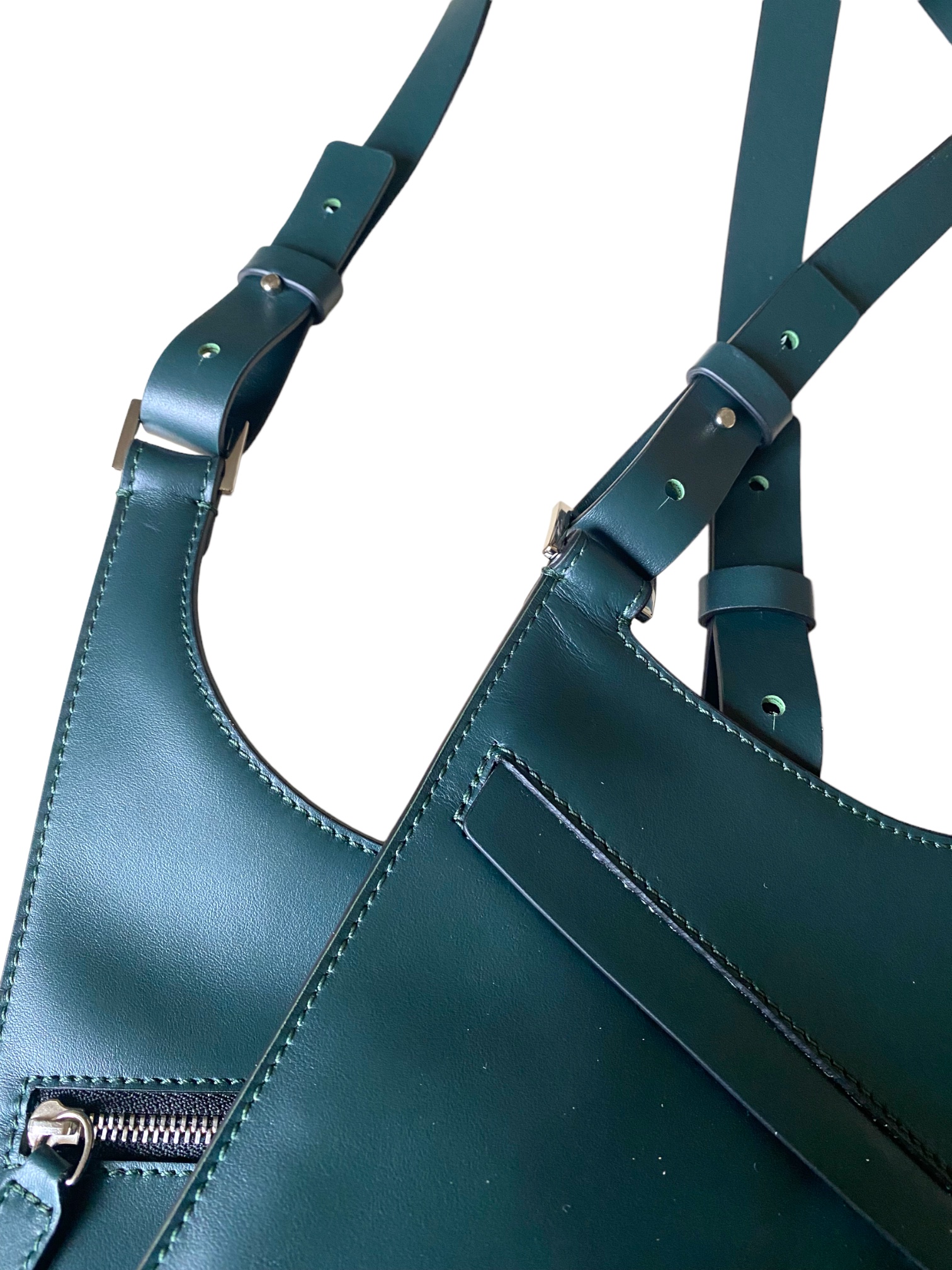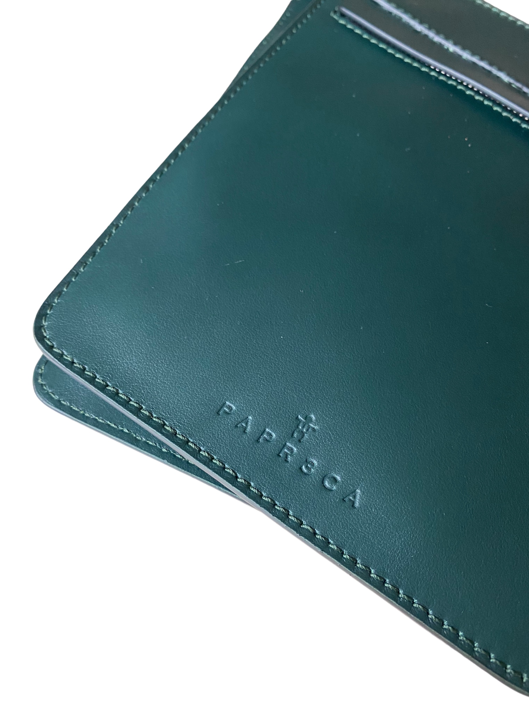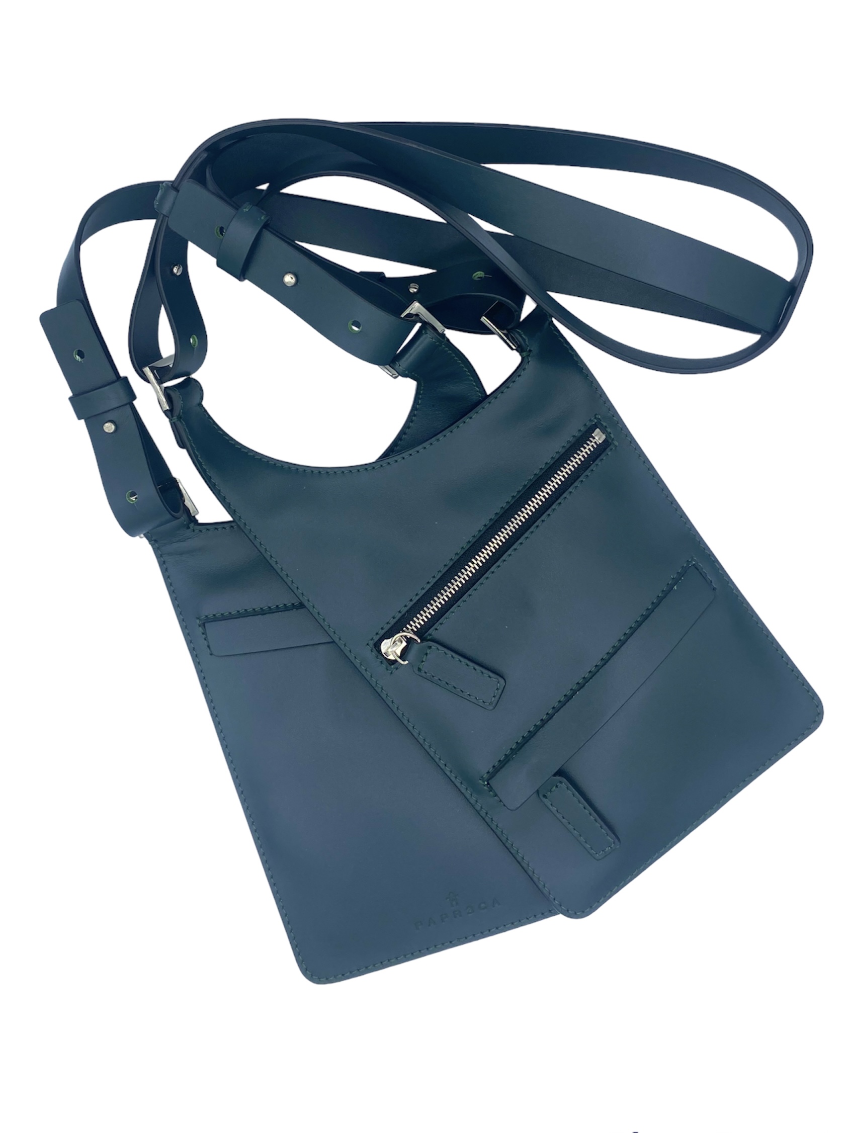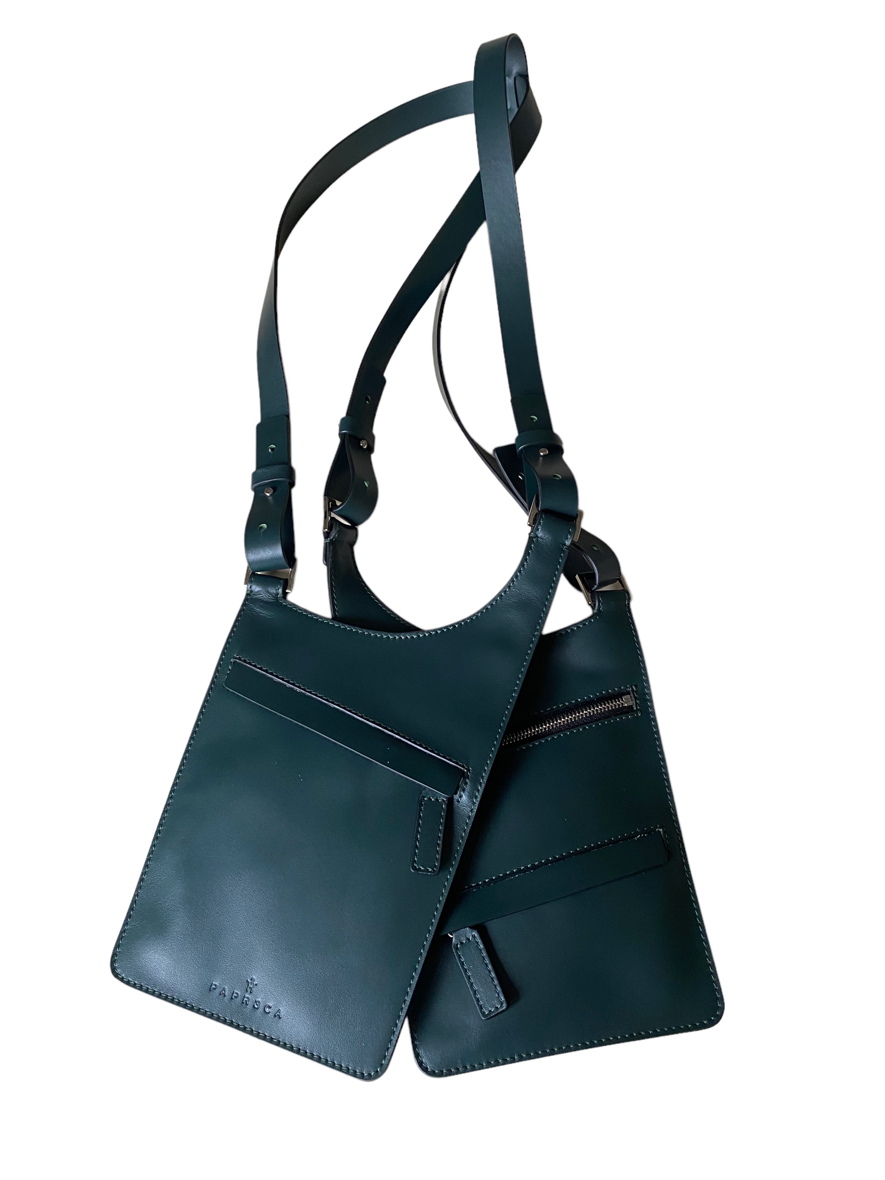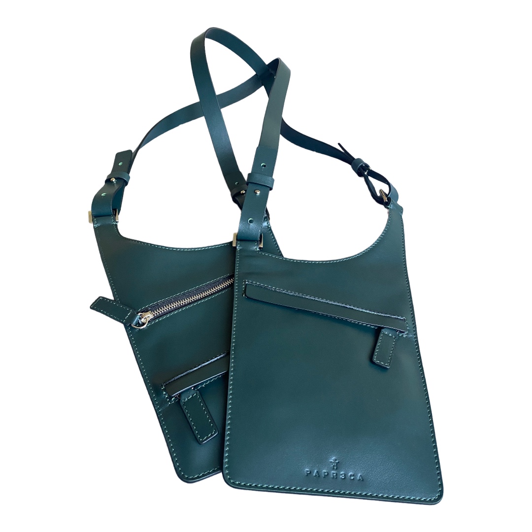Fondina realizzata in vitello verde scuro, da portare a spalla.